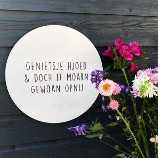 Met deze gave buiten muurcirkel fleur jij je tuin, veranda, balkon of oprit leuk op en breng je wat meer sfeer en dynamiek buiten! De muurcirkel is voorzien van een mooi ontwerp, namelijk een Friese tekst: Genietsje hjoed en doch it moarn gewoan opnij. Het is een echte eyecatcher voor in je tuin en staat ontzettend leuk in combinatie met ons andere verschillende muurcirkels. Combineer de kleine muurcirkels met de grote muurcirkels, teksten met patronen en hang ze in een leuke opstelling op of zet ze op een rijtje naast elkaar! Alles kan én alles mag.