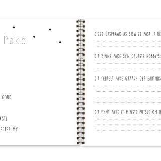 Met het ‘Pake is de alderleafste’ invulboekje heb je een origineel cadeau voor de liefste pake in huis. Vul het boekje in voor jouw allerliefste ‘pake’ en hij ontvangt een unieke herinnering aan jou of jullie. Het boekje bestaat uit 30 stevige pagina’s en staat vol met vragen, fotoruimtes en quotes. Het boekje kan voorzien worden van lieve en grappige woorden, maar bevat ook 6 fotopagina’s. Als het boekje is ingevuld is het een mooi monumentje/aandenken vol liefde en herinneringen! Erg leuk om zomaar, of bijvoorbeeld voor Vaderdag te geven aan je ‘pake’.
