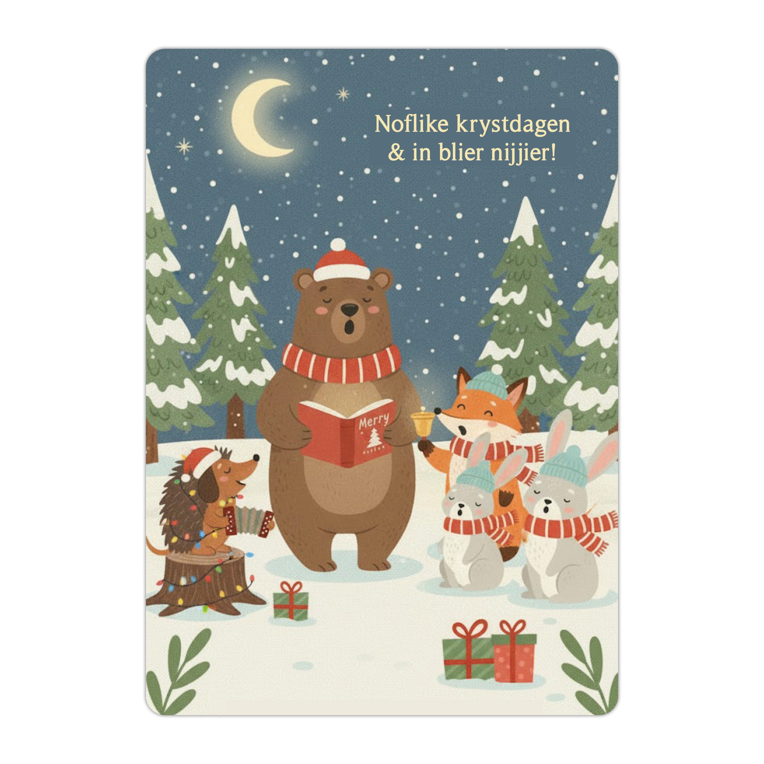 Deze Friestalige kerstkaartenset bestaat uit 6 stijlvolle Friese kleurige kerstkaarten voorzien van mooie geïllustreerde kaarten met dieren in een winter wonderland.