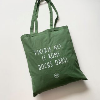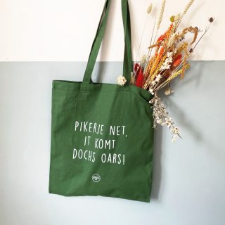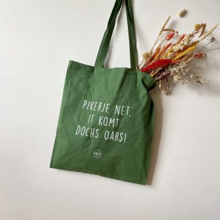 Deze leuke leger groene schoudertas is handig om je agenda, schrijfgerei, lunch en / of portemonnee in mee te nemen. De katoenen tas is groen en bedrukt met de Friese tekst: Pikerje net, it komt dochs oars.