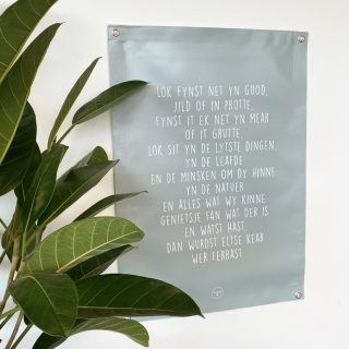 Met deze Friese tuinposter fleur jij je tuin of balkon leuk op tijdens de mooie lente of zomerdagen! De tuinposter is voorzien van een mooie Friese tekst die erg geschikt is voor mooie dagen en avonden, maar zeker ook als het wat minder lekker weer is. De tekst legt mooi uit dat geluk niet zit in spullen, geld of meer, maar in de kleine dingen en de mensen om je heen. De tuinposter is voorzien van ringen op de hoeken waarmee je de poster gemakkelijk en stevig kunt ophangen.