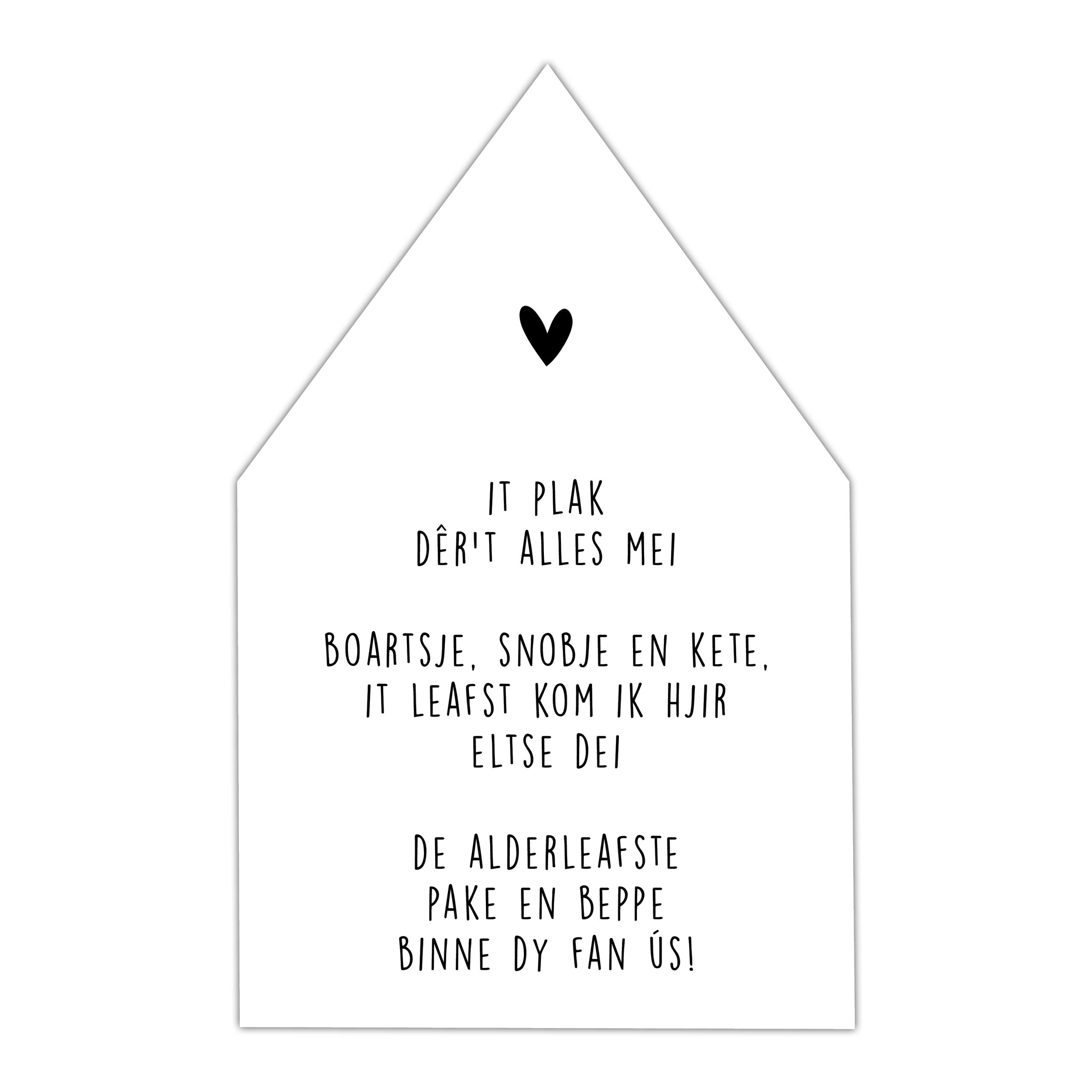 Met dit gave huisje fleur jij je interieur leuk op en breng je wat meer dynamiek in huis! Het huisje is voorzien van een mooie Friese tekst, welke erg geschikt is om cadeau te geven aan je opa en oma. Zet het huisje in een mooie standaard in een kast of op een plankje! Alles kan én alles mag.