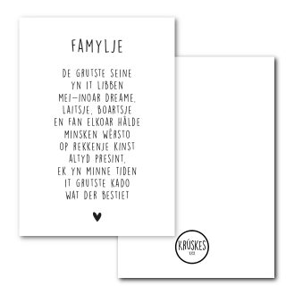 Deze mooie Friese poster is erg leuk om op te hangen of neer te zetten in je interieur. De tekst helpt je er aan herinneren dat familie toch het allerbelangrijkste is in het leven. Hij past in ieder interieur door het zwart/wit design. Leuk om voor jezelf te kopen of leuk om cadeau te geven met bijvoorbeeld een mooi klembord!