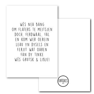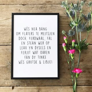 Deze mooie Friese poster is erg leuk om op te hangen of neer te zetten in je interieur. De tekst helpt je er aan herinneren dat je in jezelf moet geloven, je niks van anderen hoeft aan te trekken en niet bang moet zijn om fouten te maken. Ook al gaat het soms met vallen en opstaan, dat is helemaal niet erg! Hij past in ieder interieur door het zwart/wit design. Leuk om voor jezelf te kopen of leuk om cadeau te geven met bijvoorbeeld een mooi klembord!
